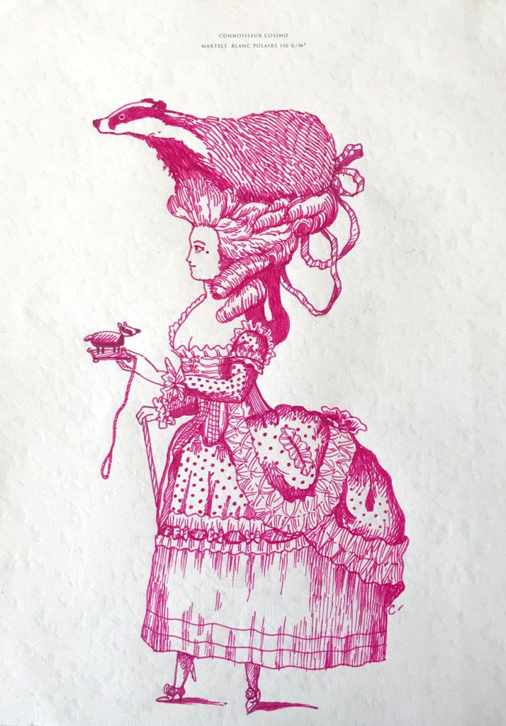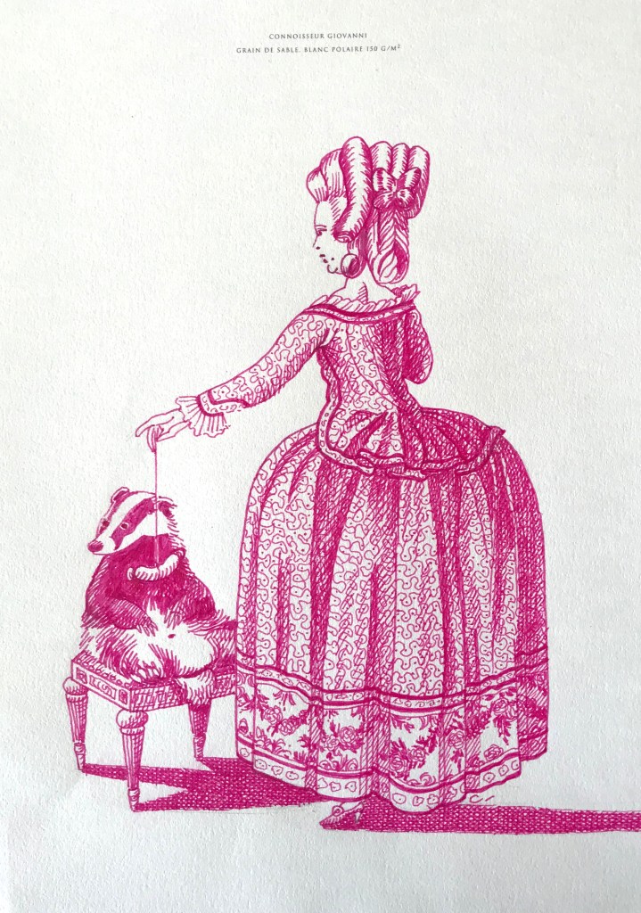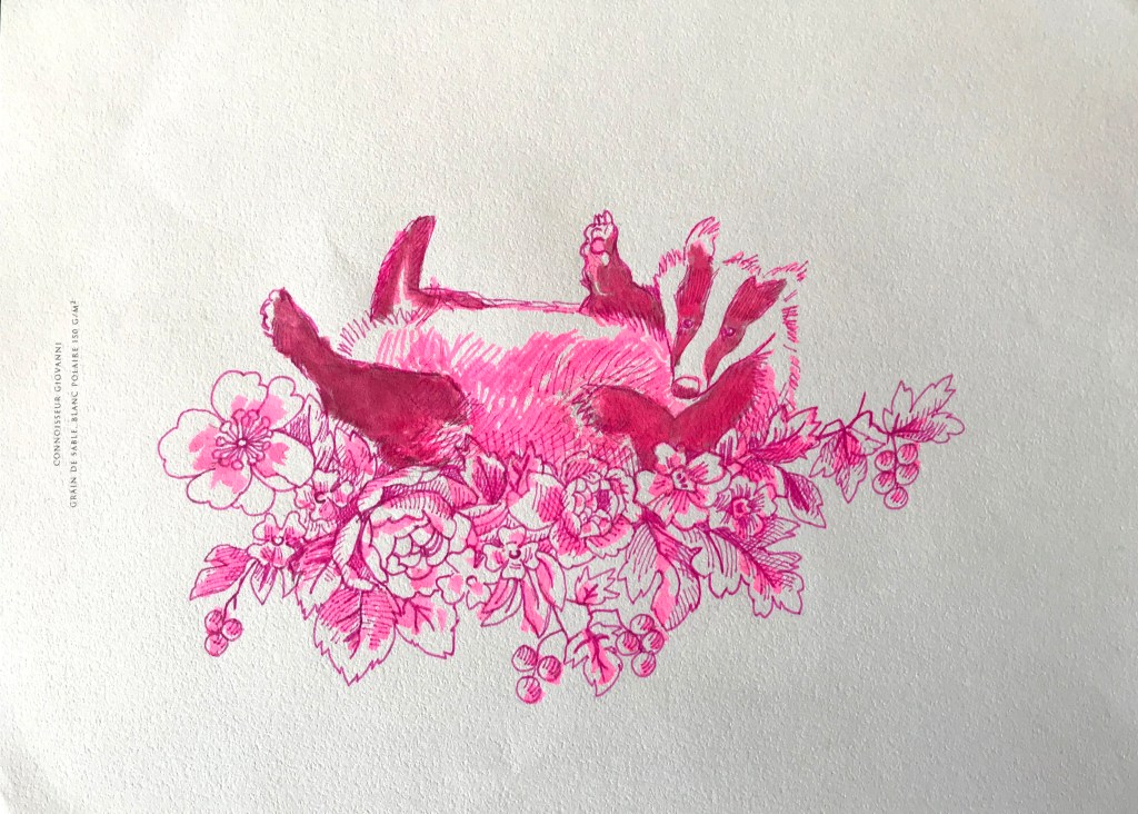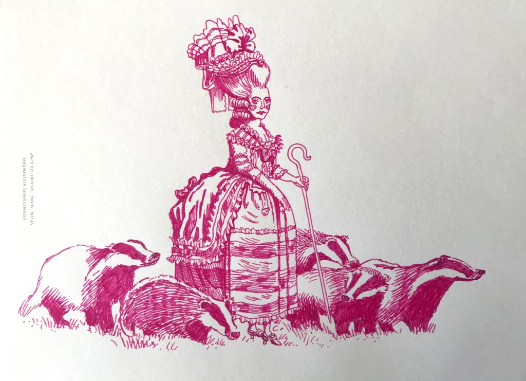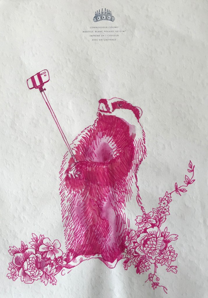 Cet ensemble de peintures et dessins est un travail de création sans objectif très défini, un travail d’art contemporain autour de la toile de Jouy. Mais il pourrait devenir de la toile imprimée. Il est ma vision du monde où la finesse, la délicatesse et l’élégance est envahie par des blaireaux.
