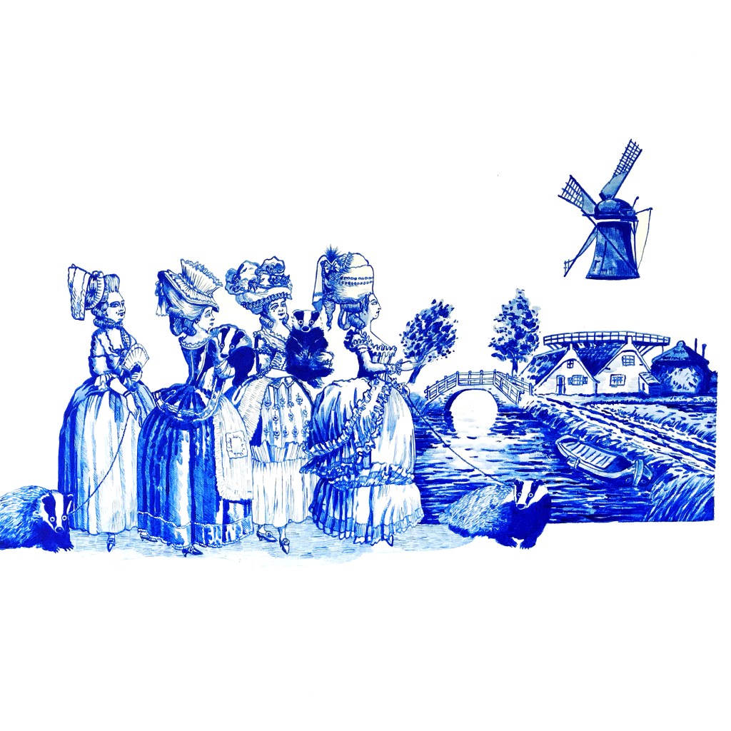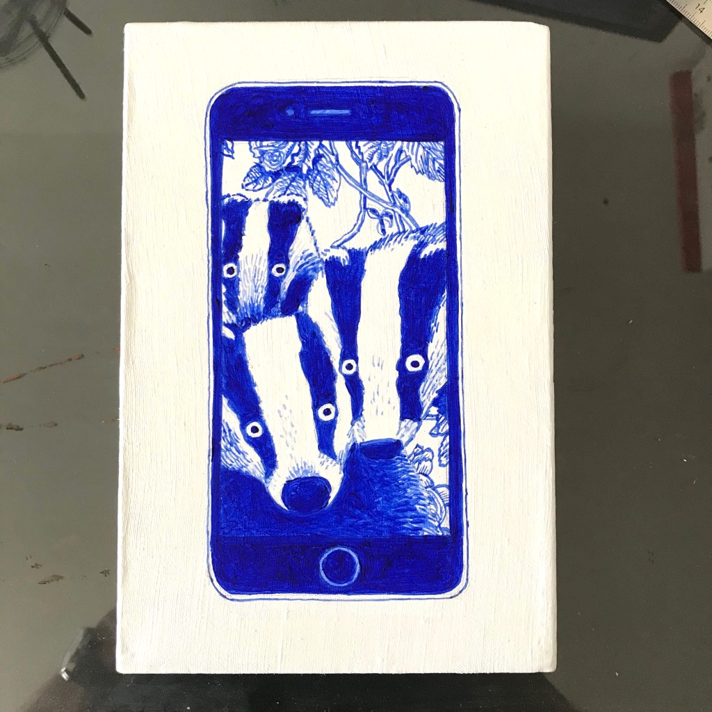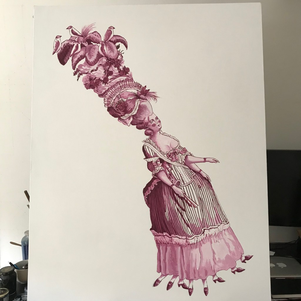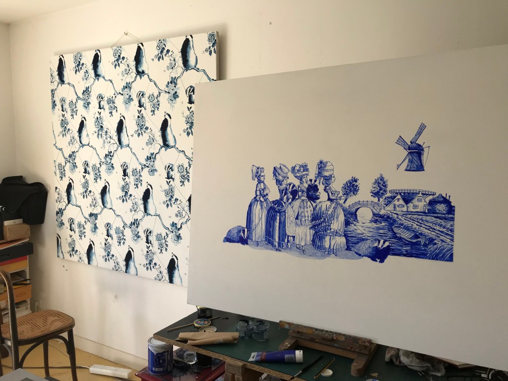 Cet ensemble de peintures et dessins est un travail de création sans objectif très défini, un travail d’art contemporain autour de la toile de Jouy. Mais il pourrait devenir de la toile imprimée. Il est ma vision du monde où la finesse, la délicatesse et l’élégance est envahie par des blaireaux.